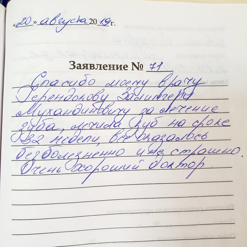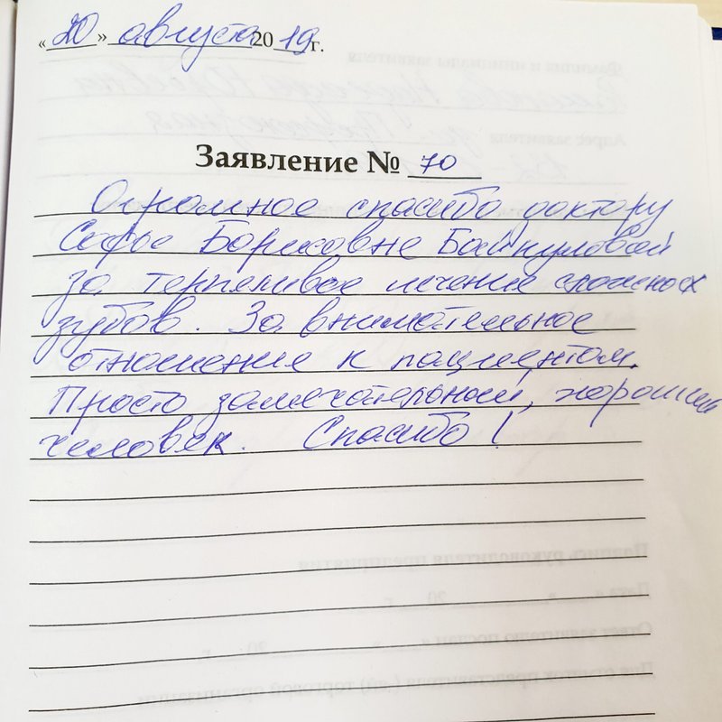 Преимущества: Была на приеме у Санговой Зульфии. Очень переживала, первое лечение зубов! Врач очень внимательная, все рассказывает, объясняет, старается чтобы не было никаких неприятных ощущений, за что ей отдельное спасибо! Лечение еще не закончено, но во второй раз я уже пойду с большей уверенностью, потому что врач очень хорошая! Спасибо вам большое!