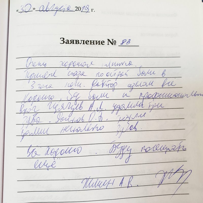 Приняли меня точно по записи, это сразу порадовало. Лечение прошло безболезненно, несмотря на серьезность проблемы - пульпит. Второй прием- контрольный, тоже прошел как по маслу, врач всё рассказал и объяснил, как ухаживать за зубами. Выражаю свою благодарность.
